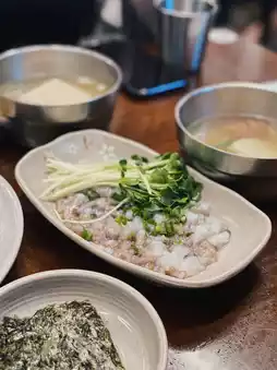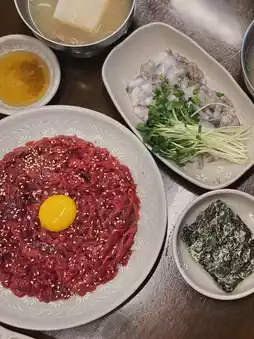 This time I came to #Buchun生酱牛肉 (부촌육회) just to accompany my friend to check out this raw beef specialty store that has won the Bib Gourmand recommendation for 8 consecutive years!!!Buchun生牛肉부촌육회 본점 itself has two branches near Gwangjang Market. The one inside the market is the main store, and the one we went to is the branch on the street. There are queues for both. There aren't many menu options. The menu of this restaurant is simple and mainly revolves around raw beef, whether it's served alone, mixed with rice, or even with live octopus!