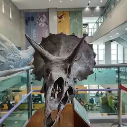There is a large and impressive dinosaur model at the entrance of the museum.