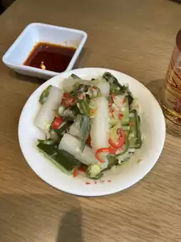 The menu consists of only three items during the day: beef noodles, dumplings, and cucumber salad. In the evening, mapo tofu, fried eggplant, and beef hot pot are added.