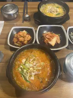 The soup is packed with ingredients such as tofu, green onions, wood ear mushrooms, other mushrooms, and fried tofu. While the bright red Seoul-style soup may seem intimidating, even those sensitive to spice can enjoy it. The yellow Namdo-style soup is extremely mild. However, it's a bit disappointing that neither version fully captures the distinctive loach flavor. Perhaps the whole loach approach is the way to go.