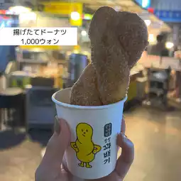 This shop is located at the entrance to the market, not far from Yukhoe Street, and there are long lines every day! It is popular for its freshly fried crispy donuts and the convenience of being only about 100 yen in Japanese yen🍩💖
