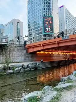 This is Cheonggyecheon Stream in Seoul. The stream stretches so long here, making it a great place for a stroll or just a break! It's a great place to stroll, as it's like the US, with warm sunlight pouring down during the day and the sunset in the evening. The abundance of trees makes this place even more relaxing. And if you sit and relax, the constant sound of water provides a soothing feeling. If you're looking for a relaxing walk in Seoul, I highly recommend this place. There are plenty of restaurants nearby, making it a great place to enjoy a stroll afterward.