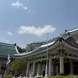 The main building features traditional Korean-style blue-tiled roofs, which look stunning against a clear blue sky. In addition to the architecture, the grounds include expansive lawns and gardens, offering a tranquil atmosphere that contrasts with the bustling city center.