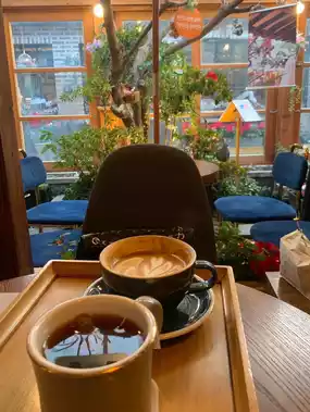 The cafe is beautifully designed, featuring bright interiors adorned with vibrant flowers that create a cozy atmosphere. It’s clear that the owner has a fondness for cats, as adorable cat figurines can be spotted throughout. The design incorporates plenty of greenery, with the standout feature being the magnificent persimmon tree at its center. Unique mug-shaped chairs add an interesting touch to the decor, and there’s a private room available for gatherings, surrounded by the inviting common areas.