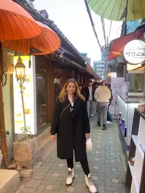 During our visit to Ikseon-dong, we took a delightful coffee break at Gamkkotdang Cafe, a charming hanok cafe built around a centuries-old persimmon tree. This beloved spot attracts both locals and tourists, offering a wonderful selection of treats, including their famous apple pie, scones, and signature egg tart.