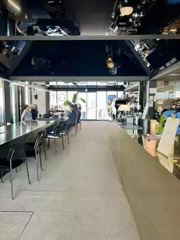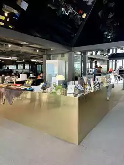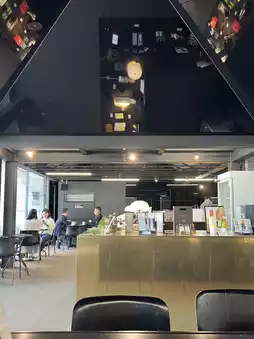 The ceiling is mirrored, making it feel spacious. If you go outside from the back of the store, you will see the tracks and you can see the trains passing by