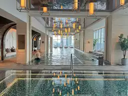 The indoor heated pool features "onyx green" mosaic tiles, with artistic installations hanging from the ceiling. Swim to the edge and enjoy the city skyline through floor-to-ceiling windows. The changing rooms are equipped with steam rooms and Dyson hair dryers. After swimming, apply a face mask and relax on heated stone loungers—it's even more rejuvenating than a spa.