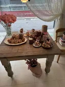 Near the register, there's a table with beautifully displayed brioche, making it a great photo spot.
