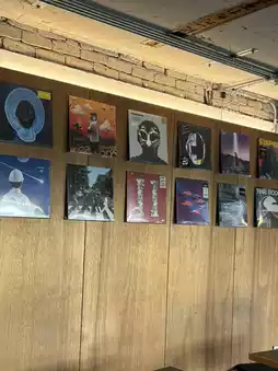 The cafe has a wood and red brick interior