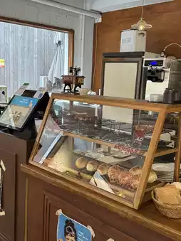 This cafe features a warm, wood-toned interior and a bright, sunny atmosphere.✨