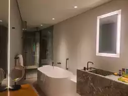 The bathroom was even more impressive—it’s clearly the highlight of the room! The colors were pleasing, and it featured a spacious, deep bathtub and a separate shower booth.