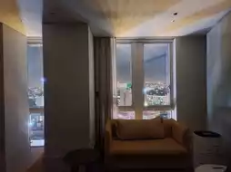 The room was quiet, and the table and chair were perfect for relaxing alone. Both the bed and sofa were comfortable and cozy. The windows weren’t floor-to-ceiling but consisted of three smaller windows with a pillar in the middle.