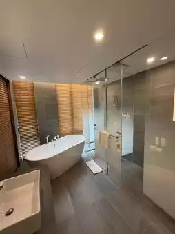 The room is not very spacious, but the bathroom features a separate wet and dry area and includes a bathtub.