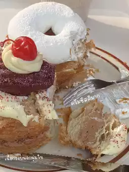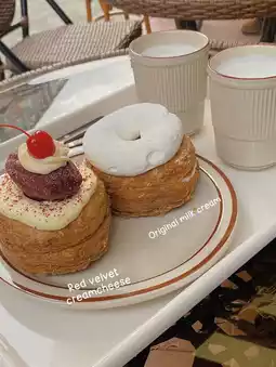 🍩🍩Seoul Pastry is a small cafe with about 10 tables inside and outside the shop. It sells cronuts, a pastry that looks like a donut but is made from croissant dough. There are many fillings to choose from. This shop usually has customers coming and going all day long. Especially on Friday-Sunday, sometimes there may be a lot of people, such as in the afternoon and evening. Be careful that the pastries might run out before you get there. On the day we went, it was 3 pm. Some of the pastries were sold out and waiting to be refilled. We chose 2 flavors. ♥️Red velvet creamcheese is a very delicious cronut. Inside is chocolate ganache, topped with cream cheese that has a sour and sweet taste, just right. Topped with cherries and red velvet madeleine that is fragrant, sweet, and dense. It's so delicious. I give this piece 10/10. I ate it all. It cost ₩5,500, about 150฿. ⚪️Milk cream is the shop's original flavor cronut and best seller. The whole piece is milk cream that is very fragrant, soft, and smooth. The sweetness is just right. It's not too rich. Cronut dough is thin and crispy on the outside, soft on the inside. Very delicious. Price ₩4,800, approximately 130฿ 📍Location: Get off at Hongik Station, Exit 3, enter through Yeonnamdong.