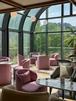 Another favorite spot of mine is the "Garden Lounge," where the lush green forest scenery contrasts beautifully with the pink furniture, creating an absolutely stunning view 🌸
