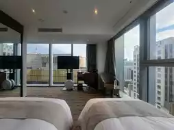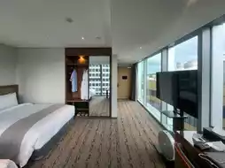The central elevator requires a transfer at the 9th floor, but the emergency elevator conveniently goes directly to the 1st floor, making it easier to go in and out after check-in. The room has a carpeted floor and a sealed window design, which enhances the open feel but limits ventilation. Thankfully, an air purifier is provided as a standard amenity. The soundproofing is excellent.