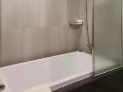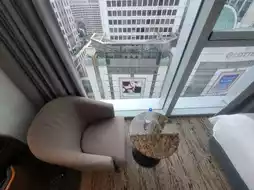 The corner-side room features floor-to-ceiling windows, offering a wide view despite being surrounded by buildings. You can spot nearby hotels, Namsan Seoul Tower, and Lotte World Tower. However, the proximity to Ibis Hotel means curtains need to be drawn for privacy. 🤣 The bathroom is spacious, with a large bathtub and shower.