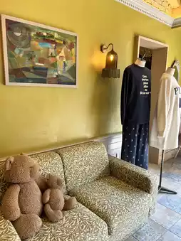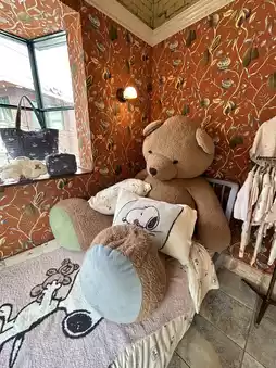 There is a large bear object in front of the store, and it is a very popular photo spot 📸✨
