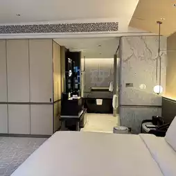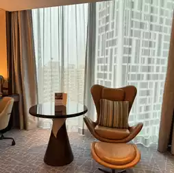 The bedding was comfortable, and interestingly, the room is equipped with a recliner chair and a small table. With two chairs available, it's perfect for enjoying a late-night snack.