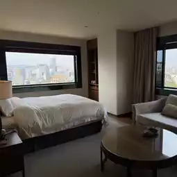 The Grand Corner Deluxe Room is a corner room, offering a spacious living area upon entry, a large window directly in front, and an additional window next to the bed. With two windows, the room feels more open and airy, providing a pleasant atmosphere.