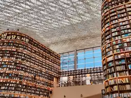Starfield Library (별마당 도서관) is a stunning open-air library located in the heart of Coex Mall in the Gangnam district. It's a must-see for book lovers, shoppers, and photographers alike. With a 13-meter-tall wall of books lining the ceiling, illuminated with warm lighting and a variety of seating options, this place has become a must-visit for visitors. 📸