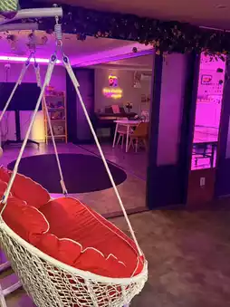✔️ Soft sofa area, cute teddy bears, cushions, and even a swing chair 💫