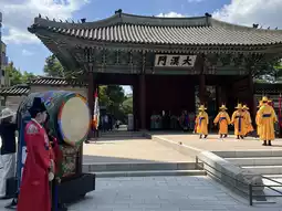 2️⃣Let's walk toward Deoksugung Palace. The sight of gatekeepers in traditional attire guarding Daehanmun Gate evokes the palace's historical significance.