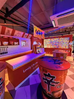 Ramen comes with a cooking bowl, priced slightly higher than regular convenience stores. Outside, there are six self-service ramen cooking machines. On the second floor, BBQ Chicken has limited seating, requiring at least a 30-minute wait to get a table before ordering. The upside is enjoying fried chicken and beer in air-conditioned comfort while saying hello to the Han River bus cruise. The area also features a mini ramen photo wall, making the ramen-eating experience both romantic and upscale.