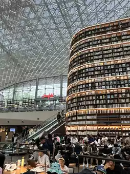 The Starfield Library is located at the heart of COEX Mall, one of Asia's largest underground shopping centers. Its towering 13-meter-high book wall is breathtaking, with natural light streaming in during the day and warm lighting creating a cosmic ambiance at night. The library features comfortable sofas, reading areas, digital screens, and an open design that allows free access, blending shopping, art, and reading seamlessly.