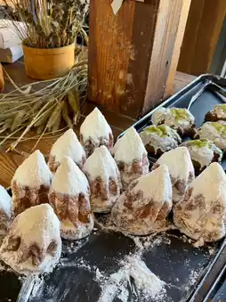 The signature dish is a pencil-shaped bread generously covered in powdered sugar.✨✨