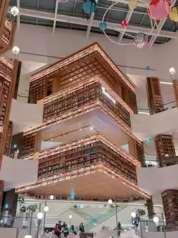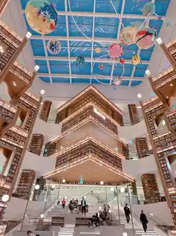 My goal this time was to explore the Starry Sky Library 2.0 from the 4th to the 7th floor. The place is truly grand, featuring a high-ceiling design with planetary decorations on the ceiling, making you feel as if you're in outer space. The visual effect is absolutely stunning. If you get tired, you can sit on the stairs to relax and read a book. Every corner here is filled with artistic vibes, making it a perfect spot for taking photos 📸 and checking in.