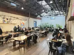 The entire cafe is a converted warehouse. The first thing you notice is how spacious it is. The seating area is divided into three sections: a sofa area with a window at the entrance, a central ordering area, and a dining area. I saw many women who looked like influencers and models posing for photos near the window. It seems like a favorite spot for influencers. We found a seat on our own. When we were about to leave, we noticed the staff actually showed us to our seats. It's probably because there weren't many people there, so they didn't control the situation. Bread and cakes were available for selection near the counter. Drinks included beer, coffee, and non-coffee beverages.
