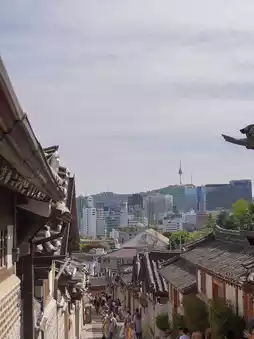 Capture stunning views 📸 of tiled rooftops with the Seoul skyline in the background.