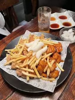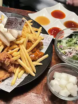 On the plate, they served French fries and fried rice cakes. They seemed to have a light dusting of honey butter powder on them, making them incredibly chewy. There were four different sauces to dip them in. The sauce was so-so, and it was delicious even on its own. There were salad and pickled radish on the side, which you can ask for refills. There were two of us, and we ordered one plate. When it arrived, we thought we wouldn't be able to finish it, but we finished it in no time, lol.