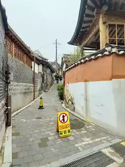 • 🏯 Traditional Korean Hanok houses lined up along narrow alleys, full of charm.