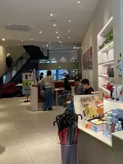 The shop features large glass windows decorated in red and black tones, A Twosome Place's signature. 💖 The spacious, bright interior offers a variety of seating options. Perfect for chatting with friends 👫, reading a book 📖, or working on your computer 💻.