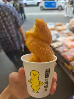 I visited Gwangjang Market for a food tour. Right at the entrance, there was a long line, and it turned out to be for the famous 'Glutinous Rice Twisted Donuts.' I immediately joined the queue. The line extended all the way outside the market, but since it was for takeout, it moved quickly. The taste of the twisted donuts, which I had high expectations for due to the long line, was amazing! The sweet sugar coating and chewy glutinous rice texture were absolutely delicious. They were freshly made, which made them even better.