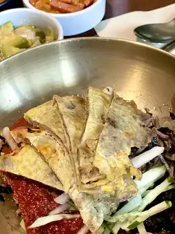 Of the menu, the potato cheese pancake and the perilla oil makguksu were particularly memorable. The pancake had a wonderfully crispy texture with melted cheese, while the makguksu had a fragrant perilla oil aroma and a chewy texture. The side dishes served were also clean and seasonal, enhancing the meal's overall quality.