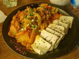 The food menu includes a variety of delicious options such as kimchi pancakes with mozzarella, potato pancakes, bulgogi hot pot, and steamed clams in alcohol.