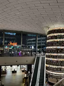 Walking into Starfield Library at night for the first time, the massive, curved book walls felt like two warm boats anchored beneath a silver, wavy ceiling. When the light strips illuminated, the entire atrium resembled the pages of an open book. Although it's an open space within a shopping mall, it possesses the orderly atmosphere of a library: people keep their voices down, read on the stairs, or simply gaze up at the "ripples" in the ceiling. My favorite angle is to shoot from the escalator's starting point, capturing the curved book wall, the escalator's movement, and the roof's texture all in one frame. Another angle involves finding a symmetrical point on the second-floor landing, allowing for a "hugging" effect between the two book walls.