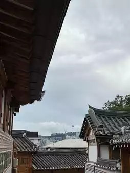 Looking back at the photos instantly transports me to the scene: narrow alleys lined with gray stone walls and wooden doors, the rooftops resembling a continuous mountain range. Above is a cloudy sky, with light softened by the clouds, making the lines of the eaves stand out in photos. Occasionally, you might hear the sound of soup boiling or a cat’s bell jingling from inside the houses, reminding you that this is a place where people truly live. I enjoy walking slowly along the slopes, and when I turn back, the rooftops frame a city skyline—a unique visual rhythm of old and new juxtaposed together, exclusive to Bukchon.