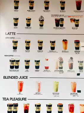 You can literally see the yellow sign "MEGA COFFEE" every few steps on the streets of Seoul, South Korea. It's a budget coffee chain that's become incredibly popular among young people in recent years! Besides its large portions and affordable prices, it also features popular Korean celebrities as its spokespersons. The cup sleeves are collectible. There are eat-in options and takeout options. Orders can be placed using a screen, making it easy even for those who don't speak Korean.