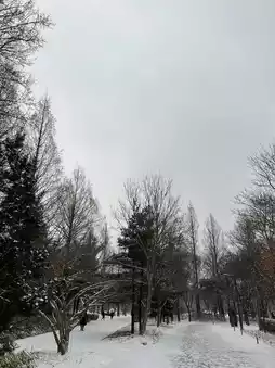 Small walking paths, gravel trails, and open fields are all dusted in snow, turning the park into a white wonderland. The contrast between dark tree trunks and white snow is stunning.