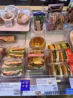 The sandwich section is a paradise for those in a hurry. 🏃♀️✨ They also have whole wheat sandwiches. Fried chicken sandwiches 🐓 and fresh vegetable sandwiches 🥬, as well as mini burgers in convenient, portable packages 🍔, are easy to fill up on at a great price.