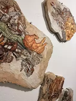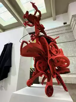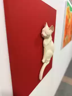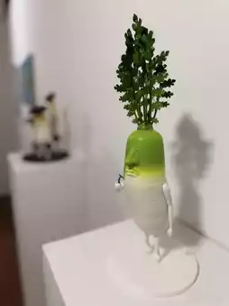 For instance, Professor Lee Sang-jang repurposed discarded robotic vacuum cleaners, dismantling and reassembling their parts into three-dimensional artworks. A baby stroller was transformed into a red beast, reflecting on the consequences of mass consumption in society. Korean artist B98C anthropomorphized mushrooms into office workers, their faces etched with frustration, and depicted a weary radish shaving its beard, adding a humorous touch. Another Korean artist, Arayah.zo, selected as a featured artist, exhibited doll paintings.