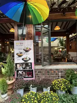 The rainbow umbrellas hanging upside down in the courtyard, blending with the tranquil scenery of the Hanok, created a bright and warm atmosphere, making our time together even more beautiful. Sharing a cup of tea in the traditional Hanok structure calmed my mind, and the sunlight streaming through the umbrellas added a cozy touch. 🌺