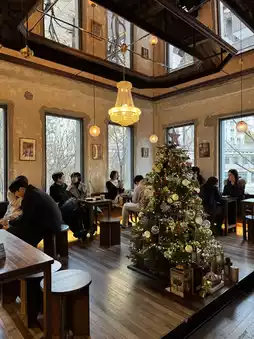 This classic modern, two-story cafe was renovated from a 1950s Western-style building, boasting high ceilings and an open, airy atmosphere.