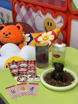 The cafe space offers a menu that's typical of Wiggle Wiggle, including drinks with bear-shaped ice cubes and adorable desserts. 🧸