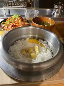 The hanok interior was preserved, making it feel like we were dining in someone's old home. Each side dish was meticulously presented, and with the charcoal-grilled hamburger steak, I thought, "Wow, this is a real hanok meal!" Eating warm rice, soup, and a refined Korean side dish felt like the perfect way to end the day.
