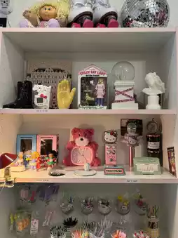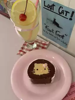 The interior is decorated in white and pink, with lots of character accessories, creating a cute atmosphere.